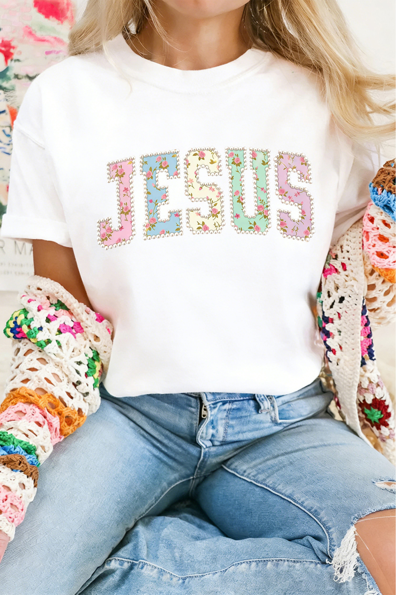 | 商品名称 | 白色 JESUS 花卉珍珠印花字母图案 T 恤 |
